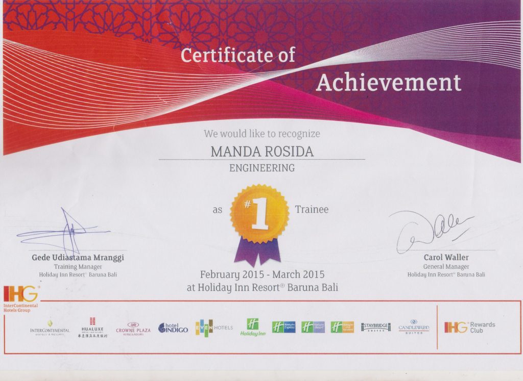 Manda Rosida merupakan salah satu mahasiswi BPLE Tiara Course yang menjalani On The Job Training di Holiday Inn Resort Baruna Bali & mendapatkan predikat The Best Trainee. Hal ini menunjukan bahwa kualitas pendidikan di BPLE Tiara Course tidak perlu diragukan lagi.